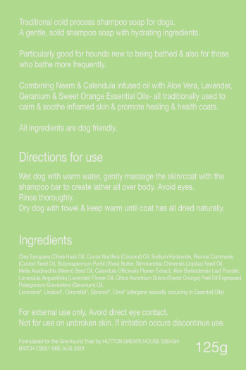 Traditional cold process shampoo soap for dogs. A gentle, solid shampoo soap with hydrating ingredients. Particularly good for hounds new to being bathed & also for those who bathe more frequently. Combining Neem & Calendula infused oil with Aloe Vera, Lavender, Geranium & Sweet Orange Essential Oils- all traditionally used to calm & soothe inflamed skin & promote healthy coats. All ingredients are dog friendly.