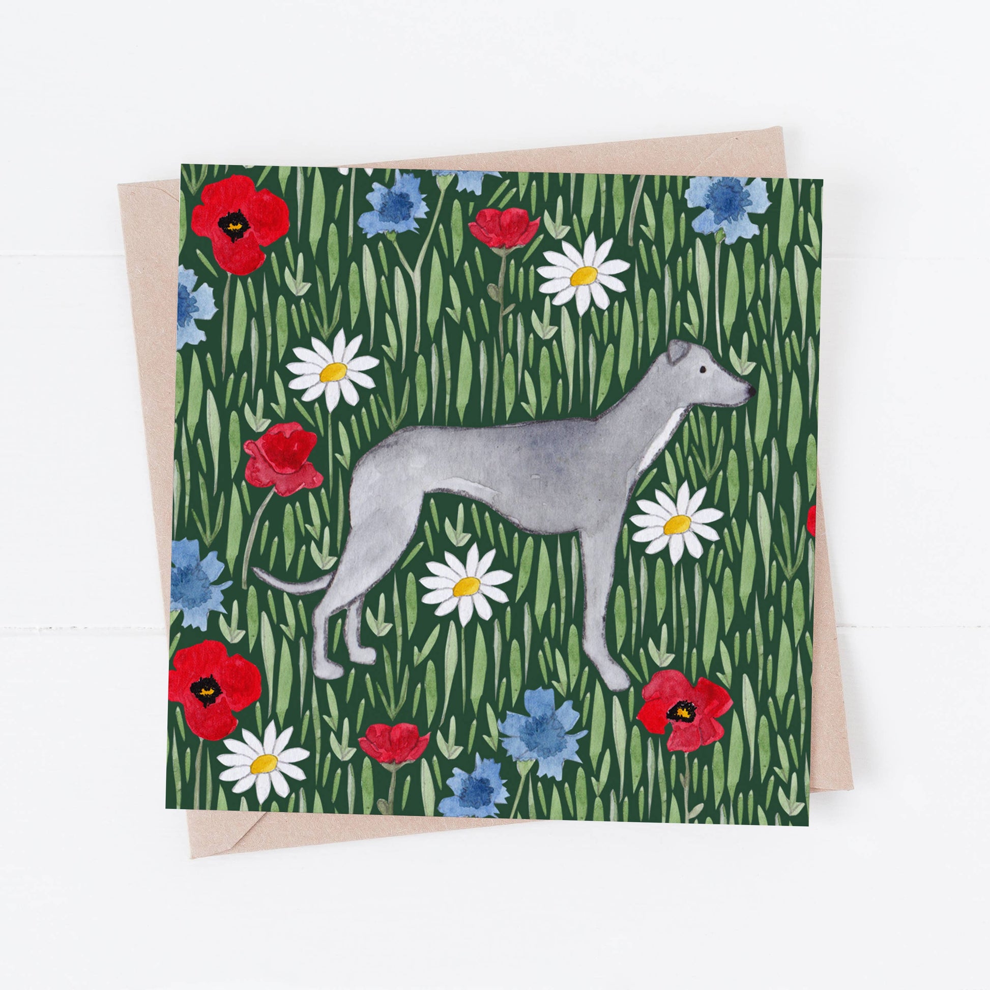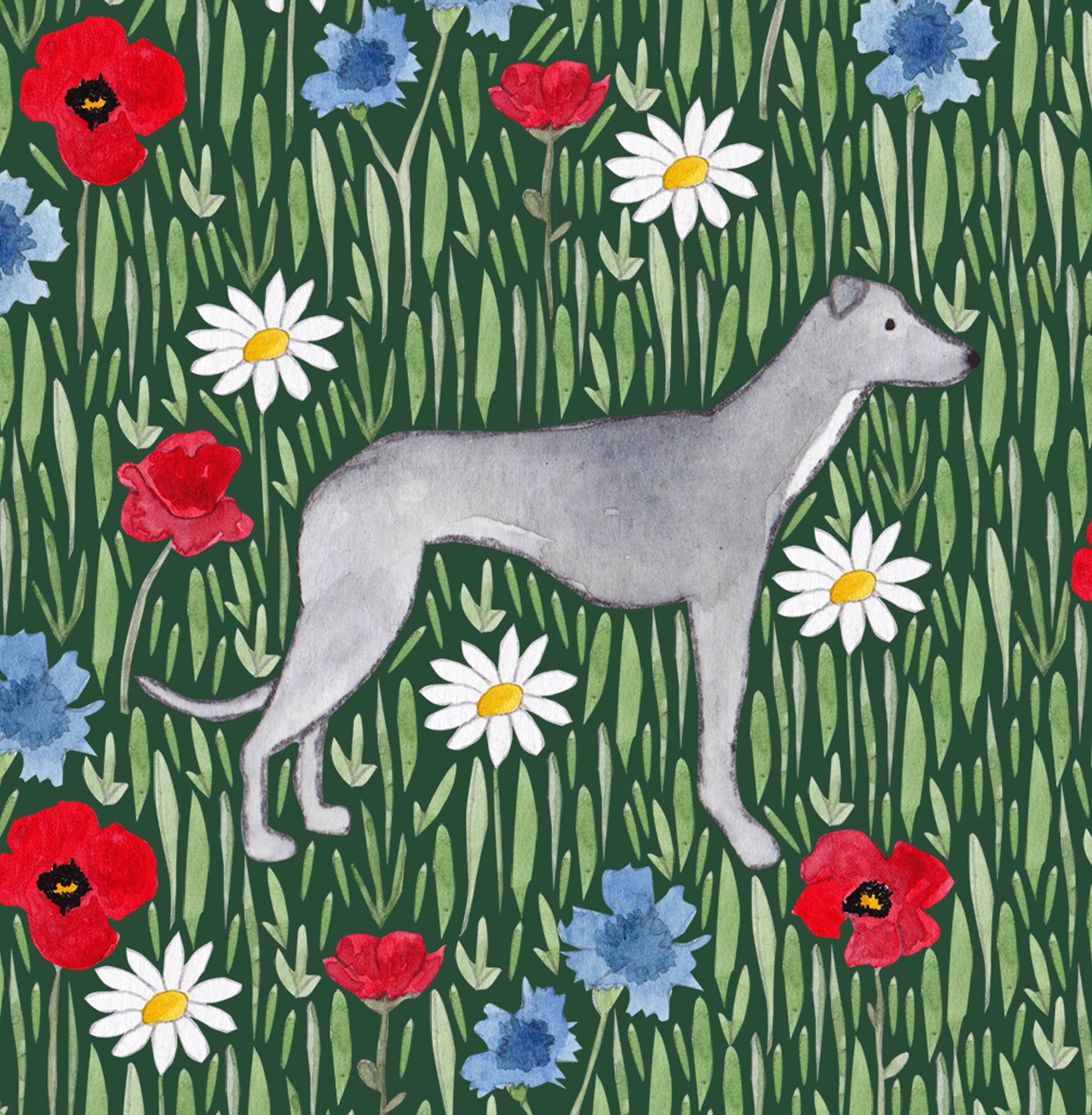 Featuring a lovely Greyhound surrounded by meadow flowers and long grass. Featuring poppies, cornflowers and daisies.