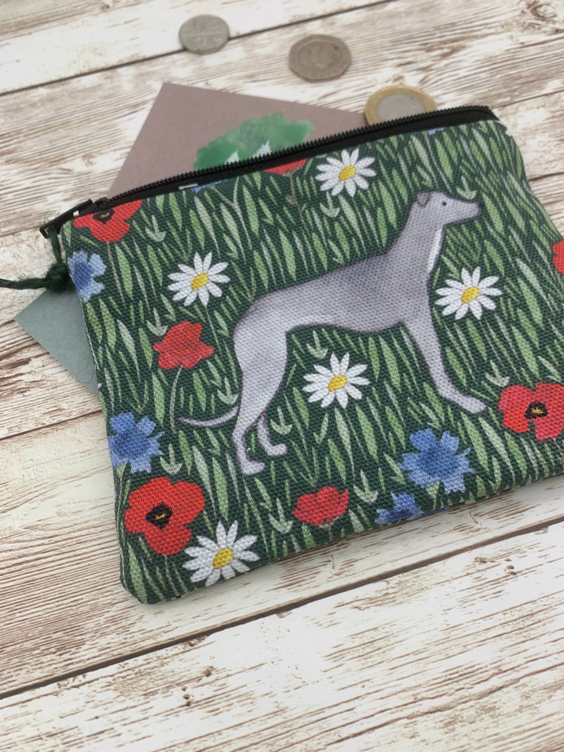 Introducing this wonderful Greyhound coin purse designed by Samantha Hall. Featuring a hand painted watercolour Greyhound amongst poppies, daisies and cornflowers.